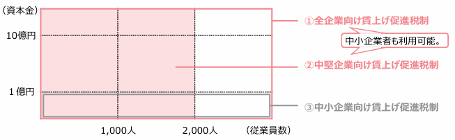 賃上げ税制は現状、大企業(全企業)向け税制、中堅企業向け税制、中小企業向け税制の3種類あり、法人にあっては適用事業年度終了の時、個人事業主にあっては適用を受ける年の12月31日における企業規模等に応じて、利用可能な税制が異なってきます。(併用は不可でいずれか1税制のみ選択適用となります。また業種・規模を問わず、企業・個人事業主は青色申告を行っていることが前提です。)