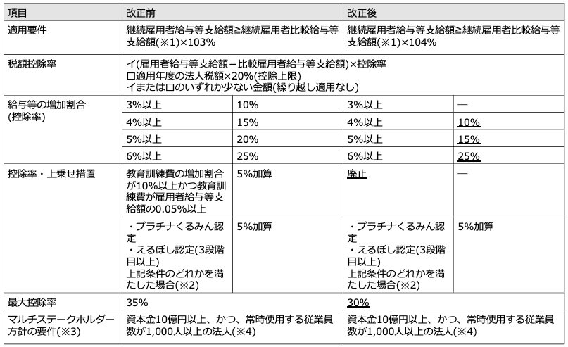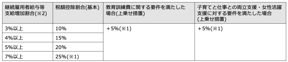 - 中堅企業向け(中小企業も利用可能)は、継続雇用者給与等支給額の引上げ幅要件を3%以上から4%以上へ引き上げた上、2027(令和9)年3月31日をも以て廃止する